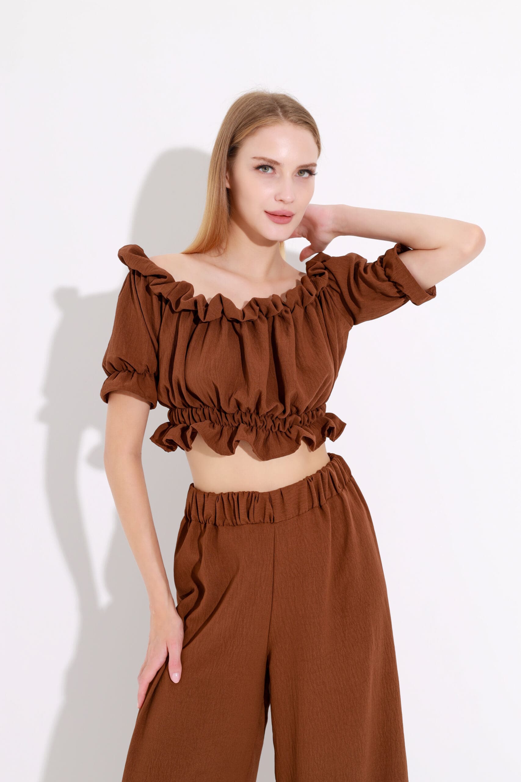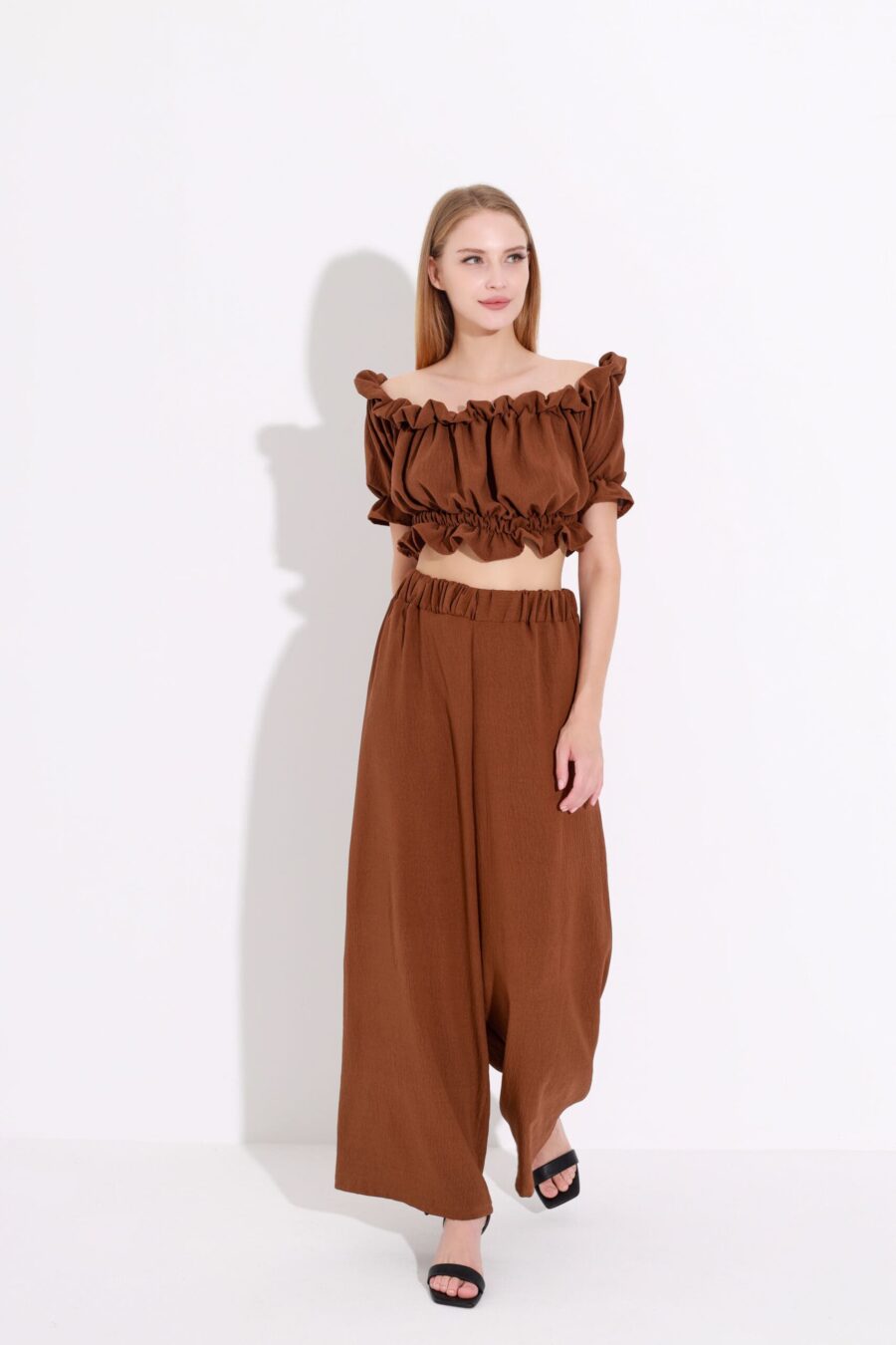 Enjoy comfort and style with these high-waisted, elasticated loose-fit brown trousers. Model details: Height: 175 cm, Bust: 85 cm, Waist: 61 cm, Hips: 92 cm.