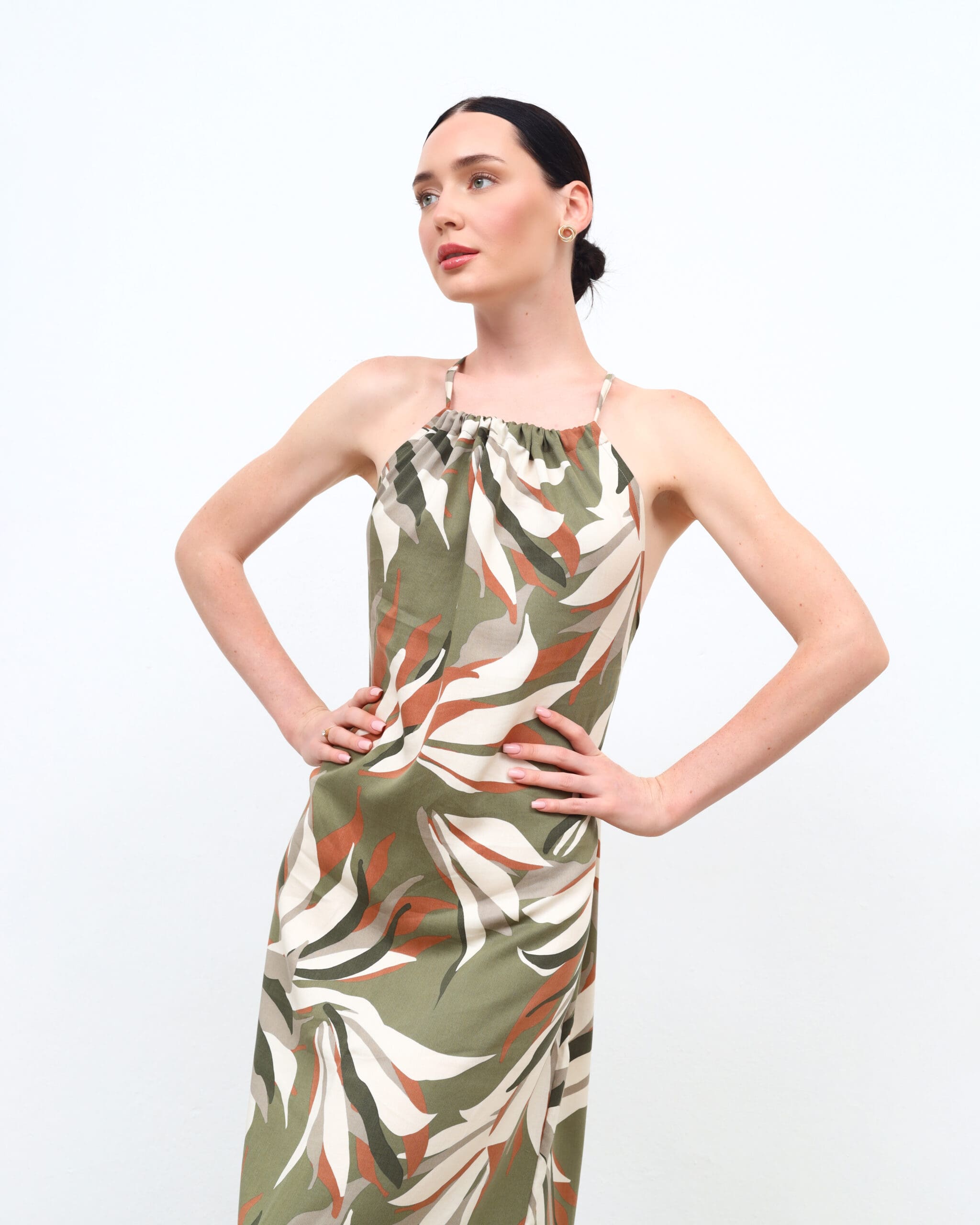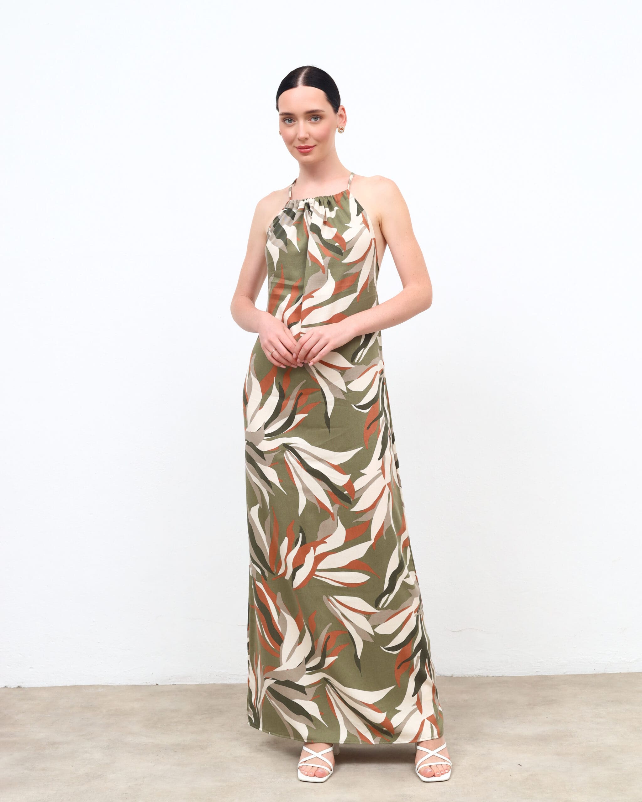 Showcase your unique style with the Khaki Floral Backless Maxi Dress. Model details: Height: 177 cm, Bust: 85 cm, Waist: 63 cm, Hips: 93 cm.