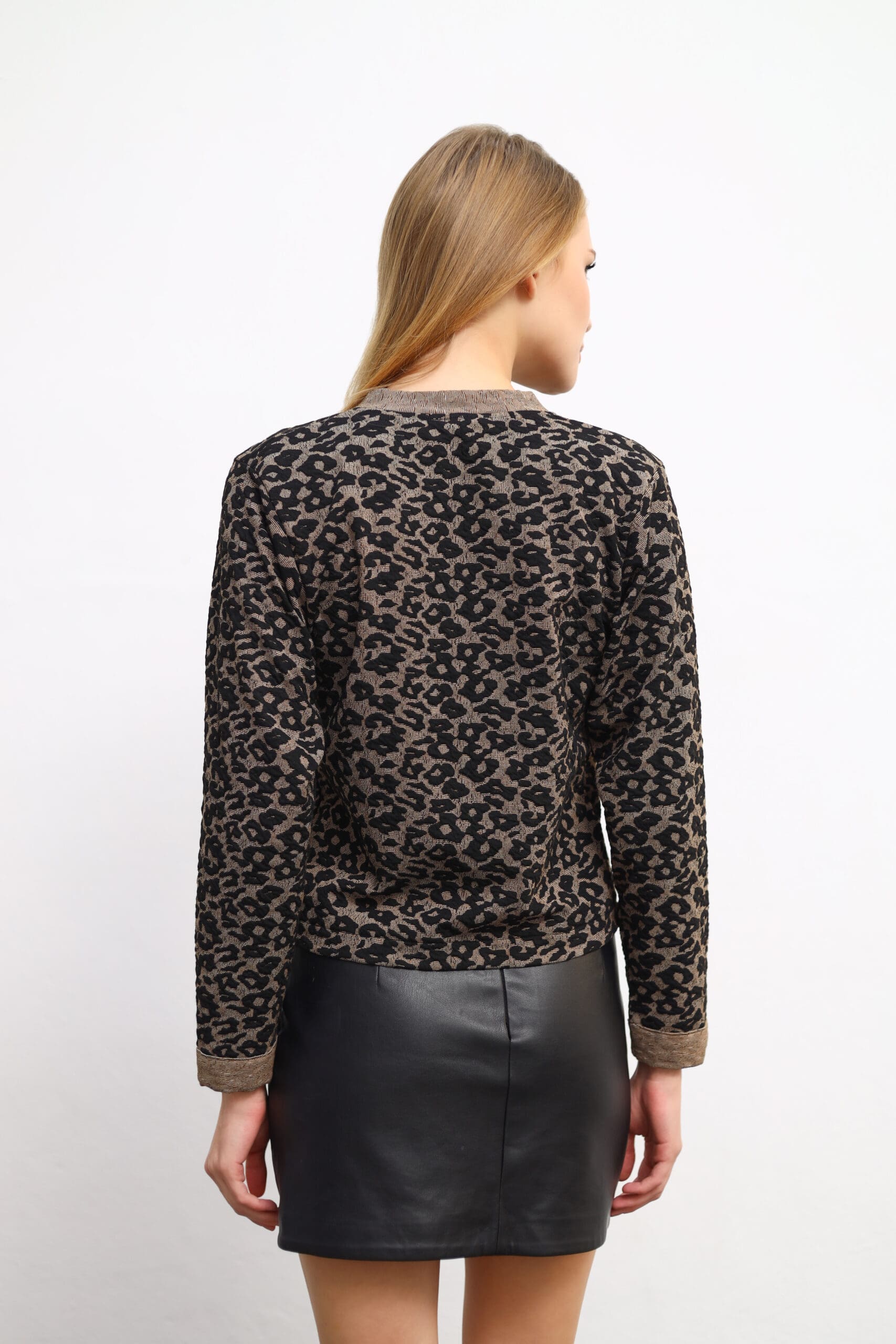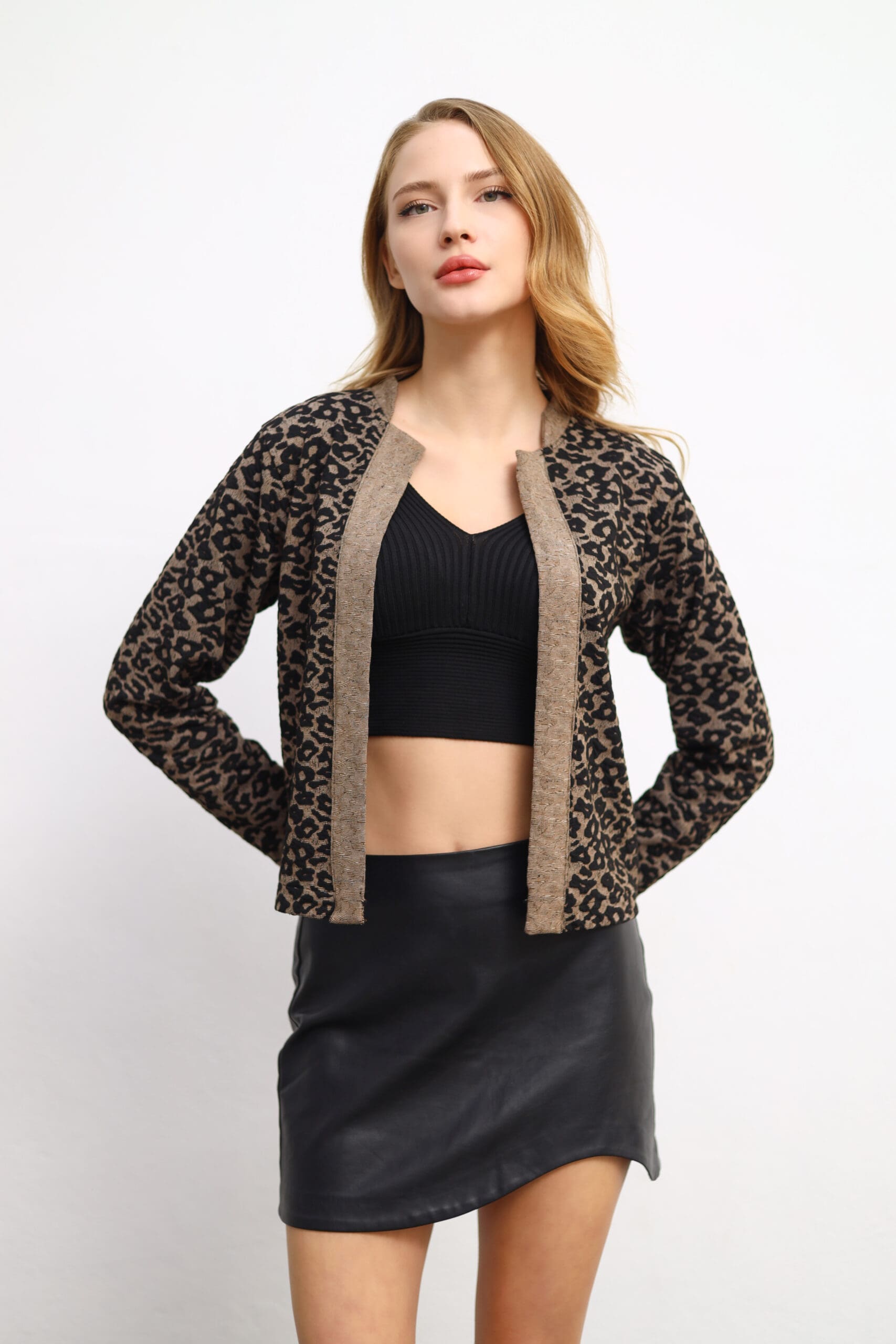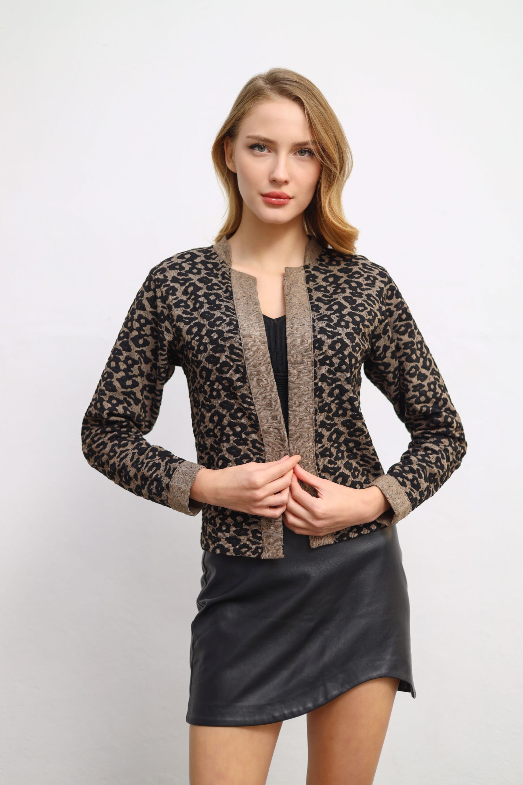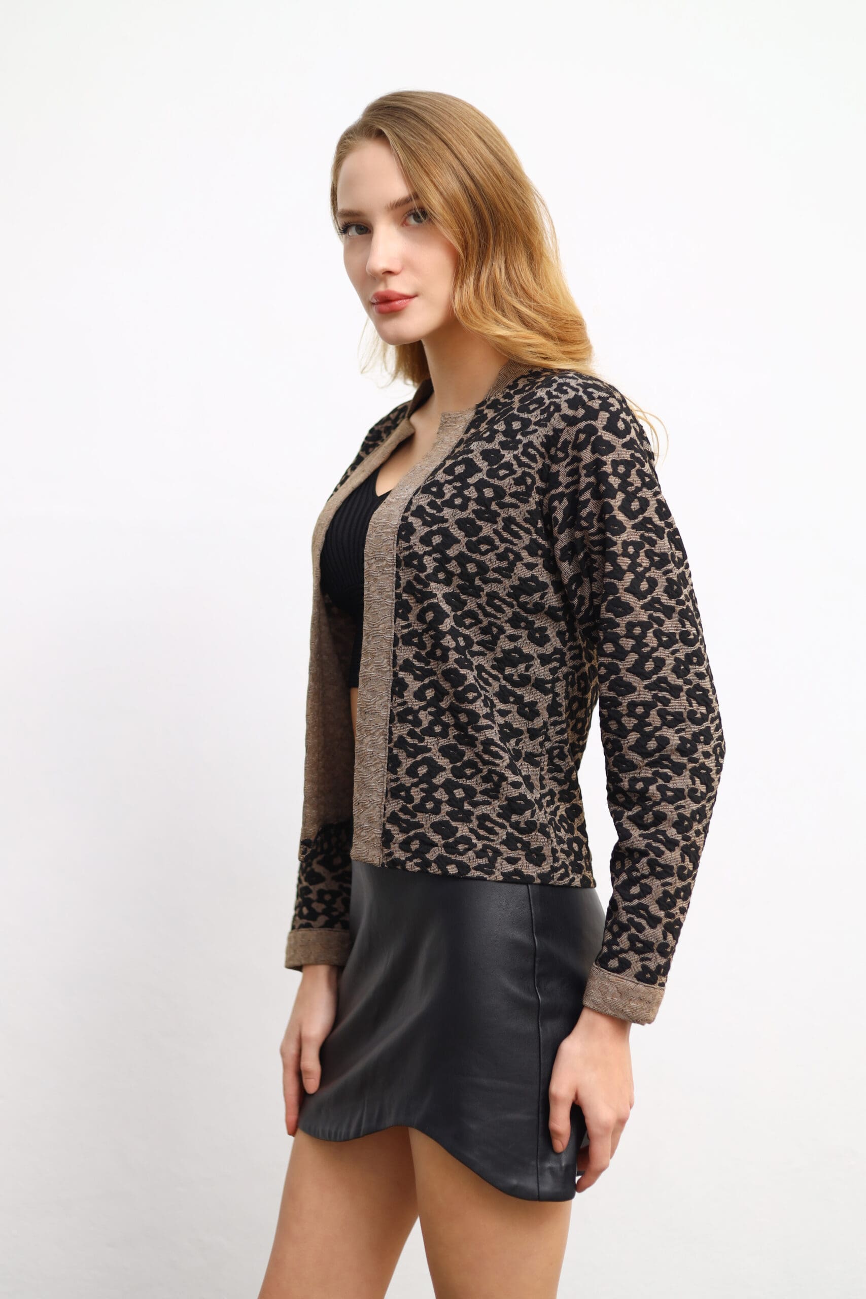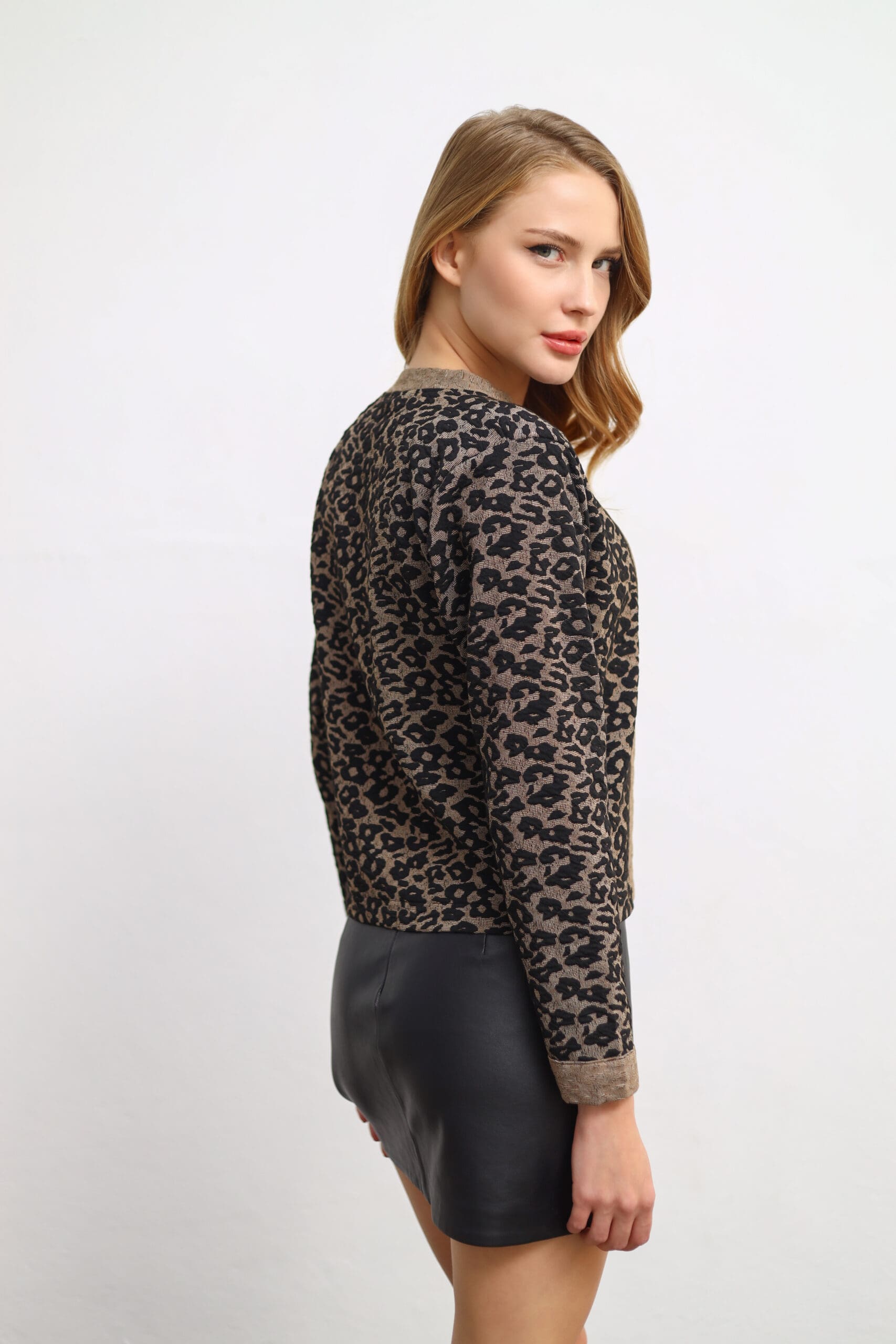 Showcase your unique style with the Mandarin-Collar Leopard Cardigan. Model details: Height: 177 cm, Bust: 85 cm, Waist: 63 cm, Hips: 93 cm.